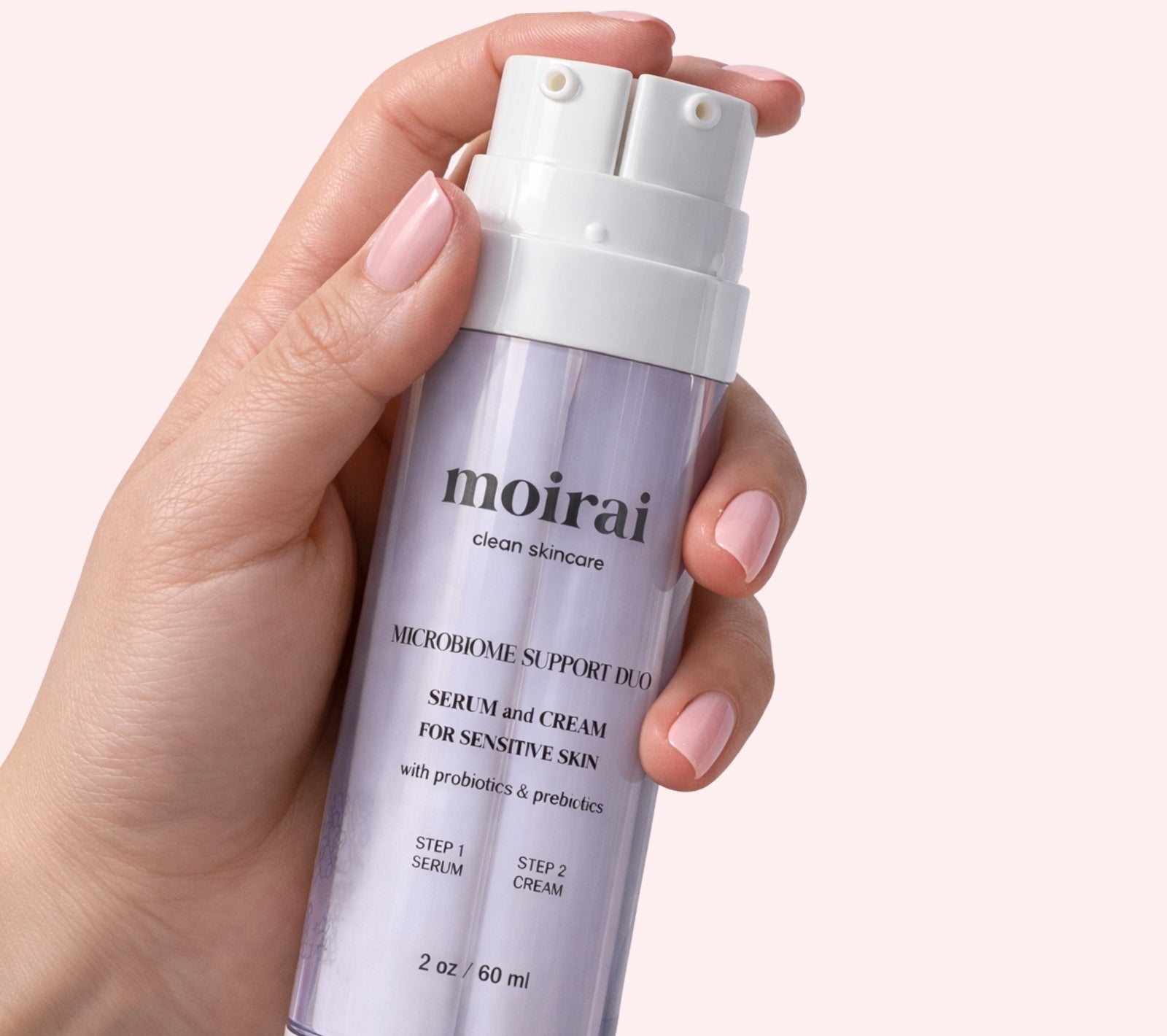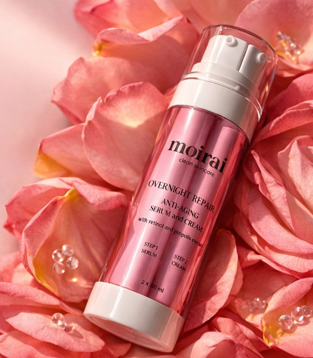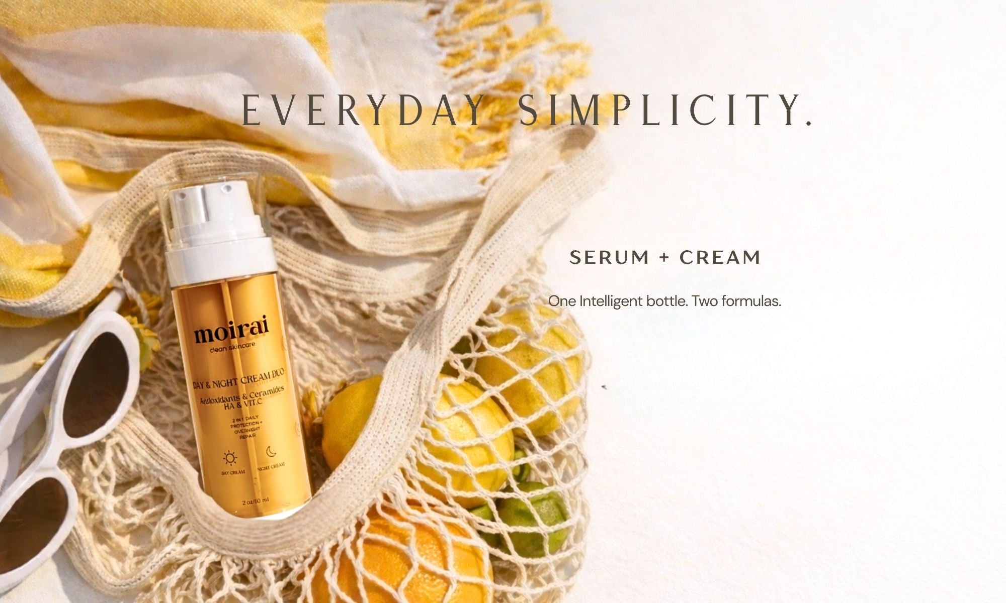 Moirai simplifies modern skincare with an intelligent Dual-Delivery design that pairs targeted treatment serum with a nourishing cream in one bottle. Each formula remains separate until application to help preserve ingredient integrity and performance.